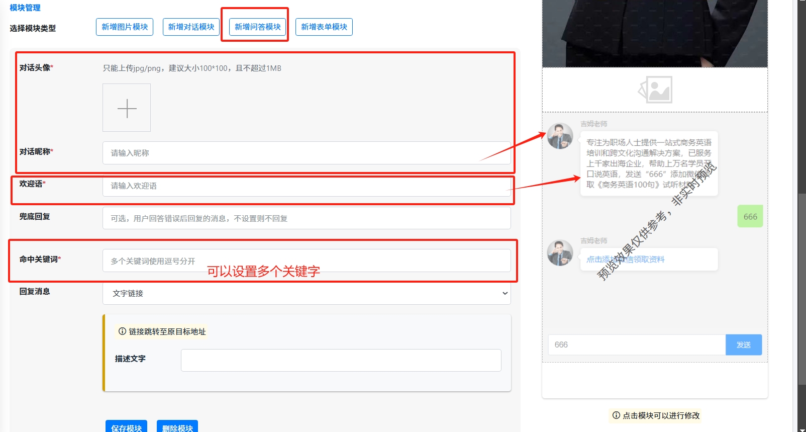 点击【新增问答模块】,让用户回答特定关键字,再显示跳转按钮,过滤一些机器人或者老年人误点击
